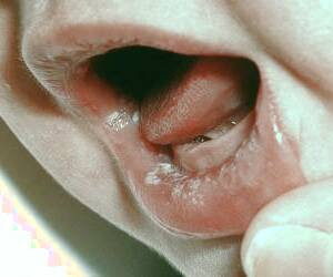 1.ضایعات سفید خامه ای بر روی زبان ، گونه های داخلی و گاهی اوقات در پشت سقف دهان؛ لثه ها و لوزه ها وجود دارد